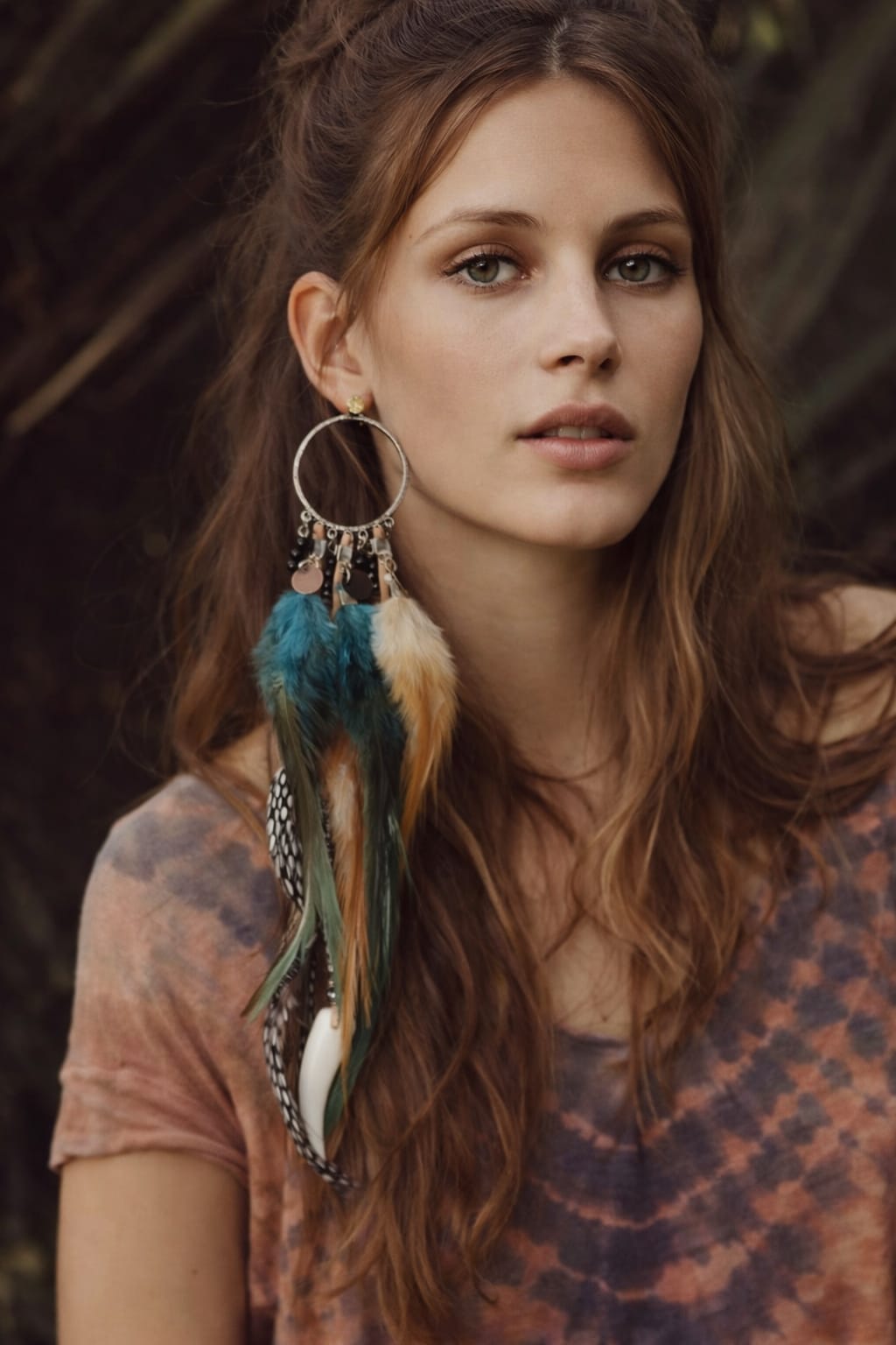 Brinco boho solitário com aro metálico, medalhas tribais, penas coloridas e pingente resinado em formato de dente. Leve, marcante e cheio de estilo.