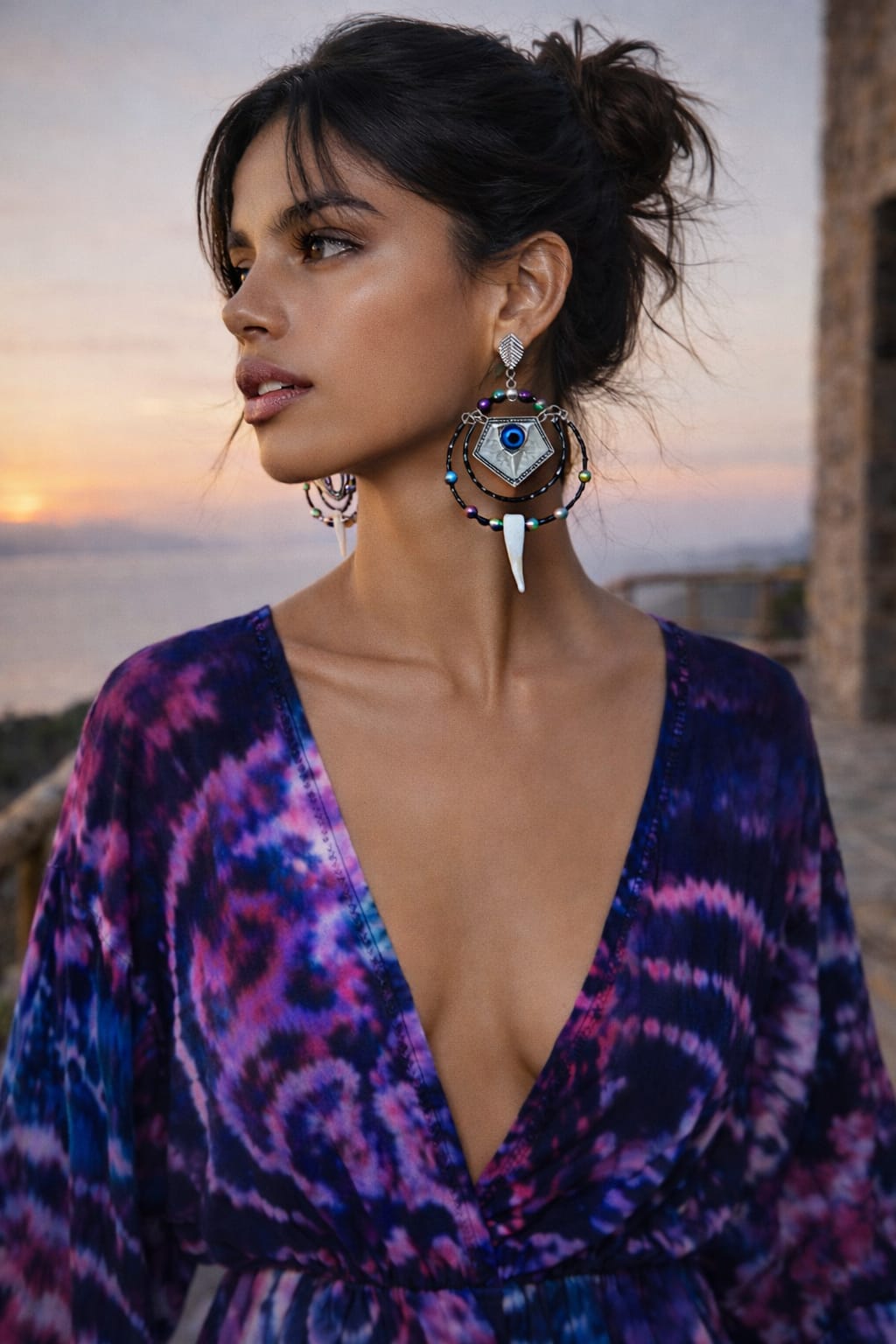 Brinco boho com argolas duplas, miçangas em tons irizados e pingente em madrepérola. O destaque fica por conta do símbolo do olho grego em metal prateado, trazendo proteção e personalidade à peça. Leve, marcante e cheio de significado, perfeito para quem ama acessórios com energia e estilo.
