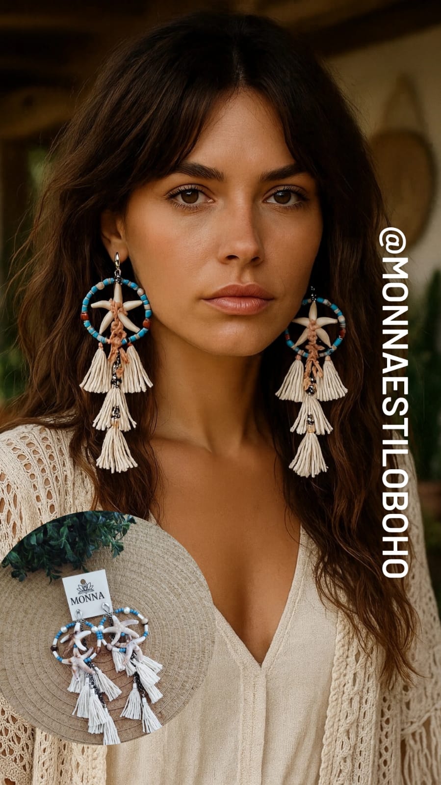 Apaixone-se pelos brincos boho com tassel, peças exclusivas produzidas artesanalmente, ideais para quem busca elegância com um toque descontraído. Cada par é feito à mão com estrelas em resina, cristais, proporcionando leveza e movimento ao seu visual. Perfeitos para compor looks autênticos.