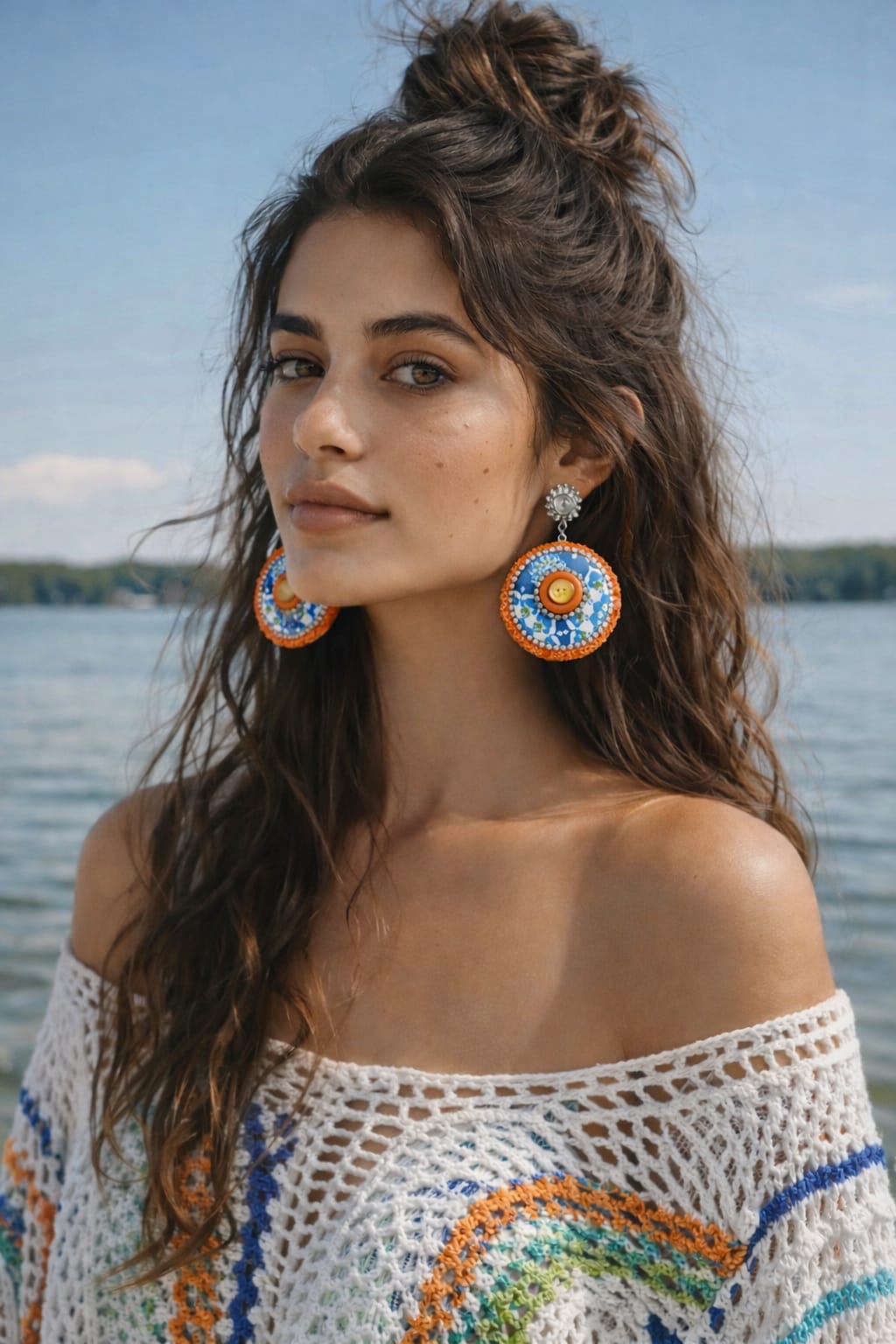 Brinco artesanal de base em resina, enriquecido com renda delicada, cristais lapidados e detalhe central em madrepérola. Uma peça leve e cheia de personalidade, que une textura, brilho sutil e um toque boho sofisticado, perfeita para iluminar produções do dia a dia ou compor looks especiais.