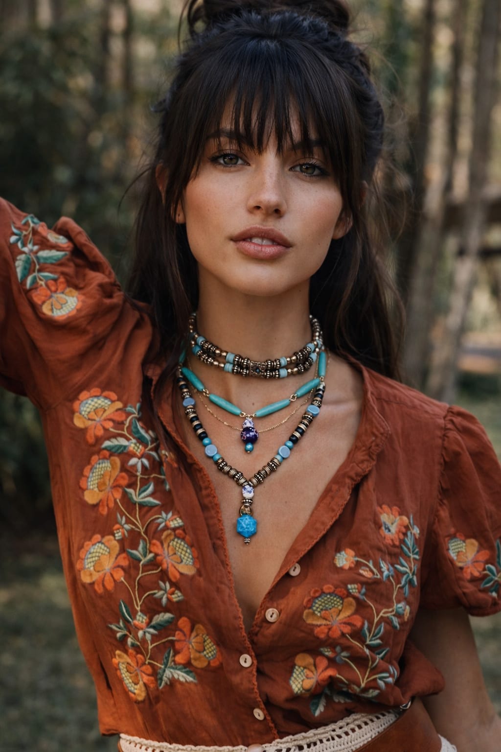 Choker artesanal em três camadas, confeccionada com pedras naturais, porcelana e metais prateados trabalhados, valorizando cada detalhe do feito à mão. O destaque fica por conta do pingente central em pedra azul, que traz personalidade e força à peça. Possui ajuste em cordão, garantindo conforto e versatilidade. Uma choker única, com alma boho, perfeita para quem busca autenticidade e presença no look.