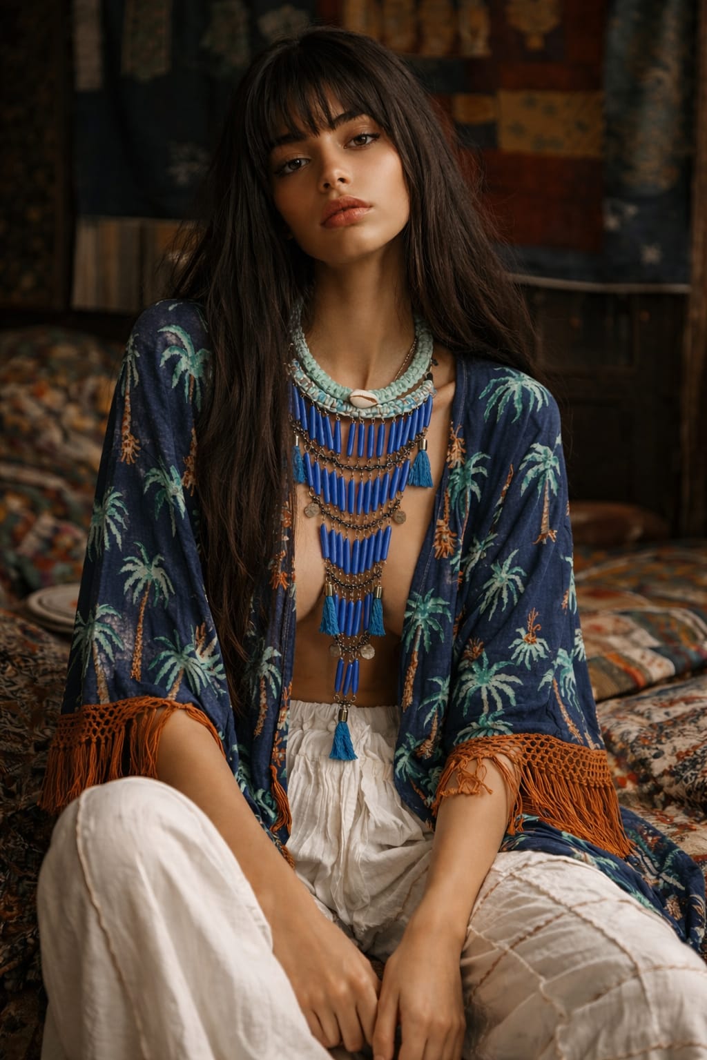 Colar artesanal de presença marcante, com trama em tom azul suave, camadas de pingentes alongados e tasséis que criam movimento e fluidez. Uma peça boho cheia de personalidade, inspirada no mar, na liberdade e na beleza natural.