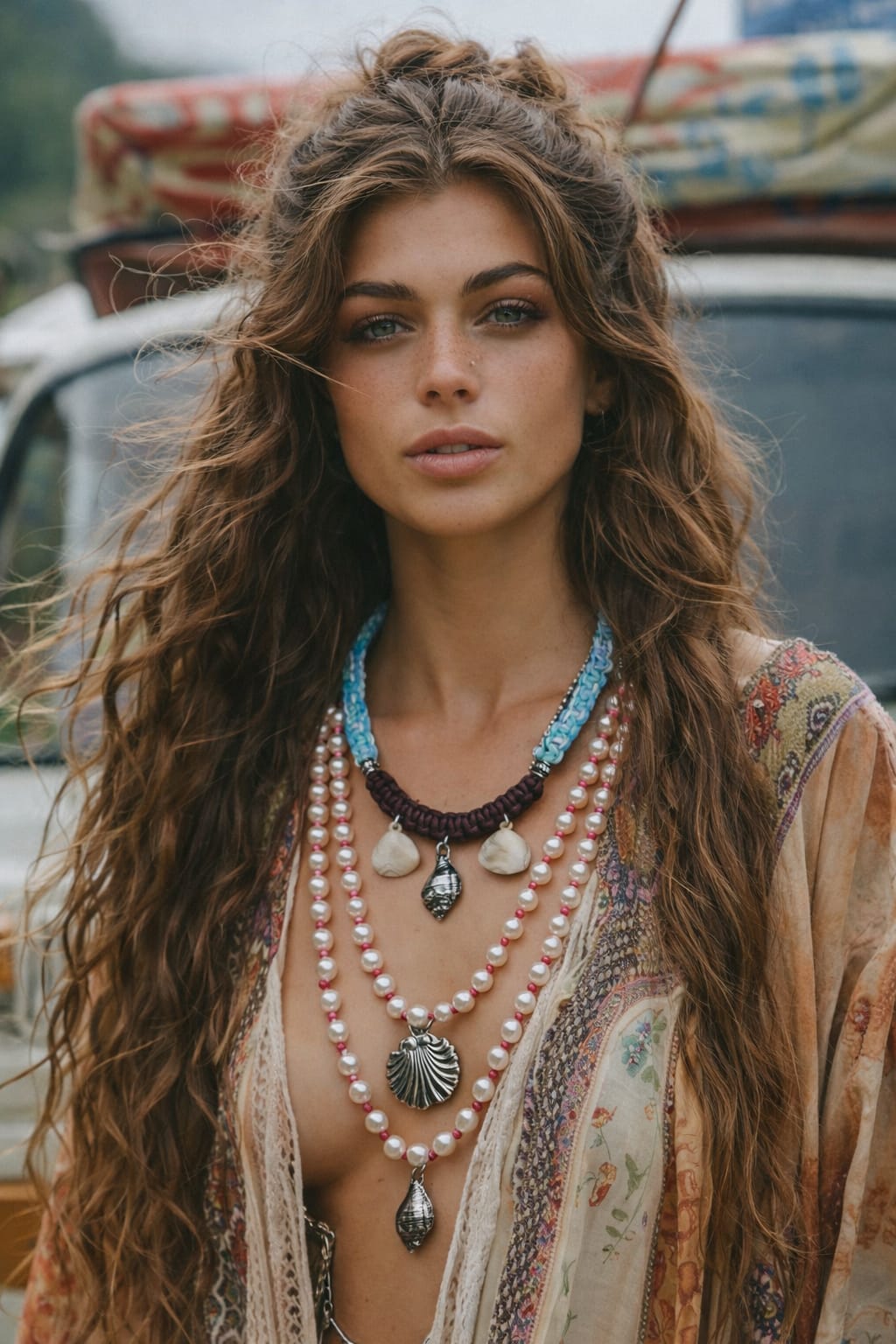 Colar artesanal com design delicado e inspiração praiana. Possui cordão superior em macramê azul claro, combinado com duas voltas de pérolas sintéticas intercaladas por pequenos detalhes em tom rosado. Os pingentes em formato de conchas e búzio prateado trazem charme e leveza, criando um visual boho sofisticado, perfeito para iluminar produções de verão ou looks descontraídos com elegância.