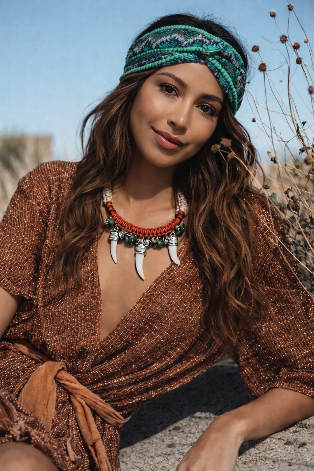 Um colar que traduz a força feminina e a conexão com a natureza. Feito à mão com trançado artesanal em tons terrosos, pedras verdes e pingentes em formato de presas com detalhes metálicos, ele carrega uma estética tribal sofisticada e autêntica. Uma peça marcante que transforma qualquer look em uma expressão de liberdade, presença e estilo boho.