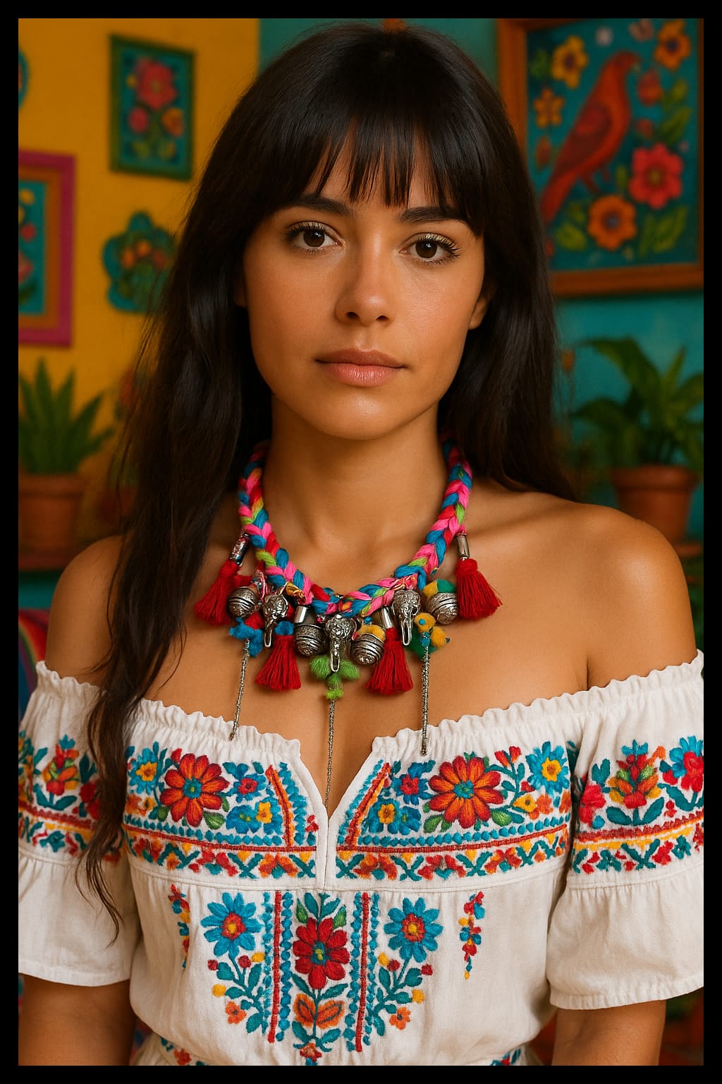 O Colar Frida é feito à mão com trançado colorido, tasséis vibrantes e pingentes únicos que transformam qualquer produção.