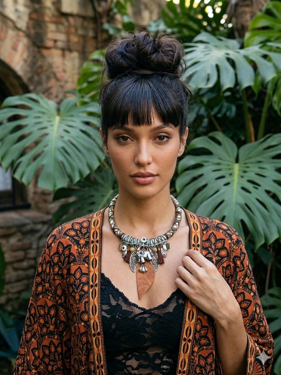 Colar artesanal de estilo boho, confeccionado com fios de algodão trançados e detalhes em couro, que garantem resistência e um toque rústico sofisticado. A peça é enriquecida com pedras naturais cuidadosamente selecionadas, além de pingentes decorativos que trazem personalidade e conexão com a natureza. Ideal para quem busca um acessório único, autêntico e cheio de estilo para compor looks leves e marcantes.