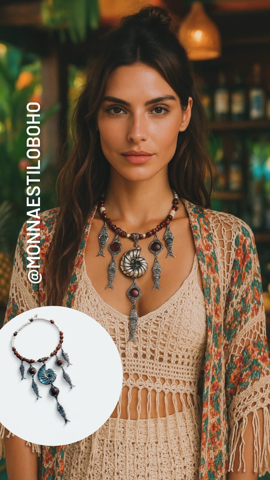 Encante-se com este colar boho artesanal, cuidadosamente confeccionado à mão com pedras naturais exclusivas e pingentes delicados em formato de peixes. Ideal para quem deseja expressar personalidade e sofisticação em um visual boho chic.