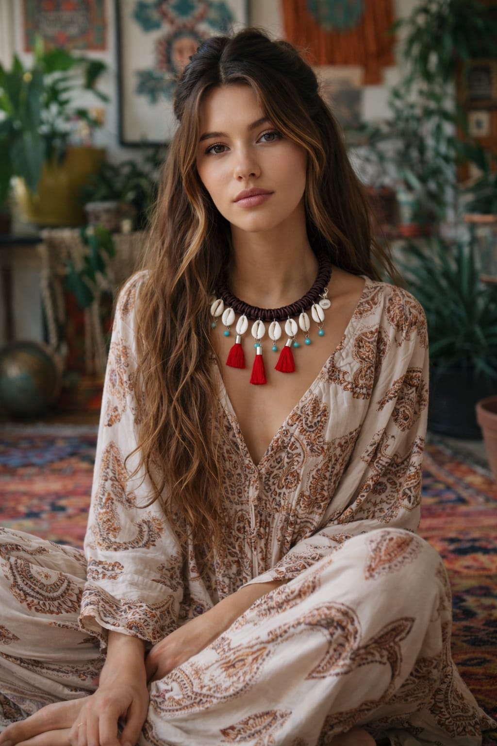 Colar artesanal em macramê com base trançada e detalhes naturais que evocam a energia do mar. A peça é adornada com búzios, pequenas contas turquesa e tasséis vermelhos que trazem movimento e personalidade ao design. Um acessório marcante, perfeito para compor produções boho com leveza e autenticidade.