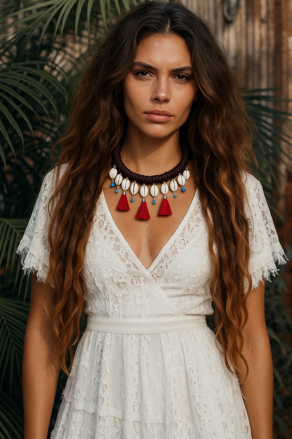 Colar boho com fios trançados marrom, conchas brancas, pedras turquesa e tasséis vermelhos. Peça vibrante e sofisticada, perfeita para complementar looks autênticos e tropicais.